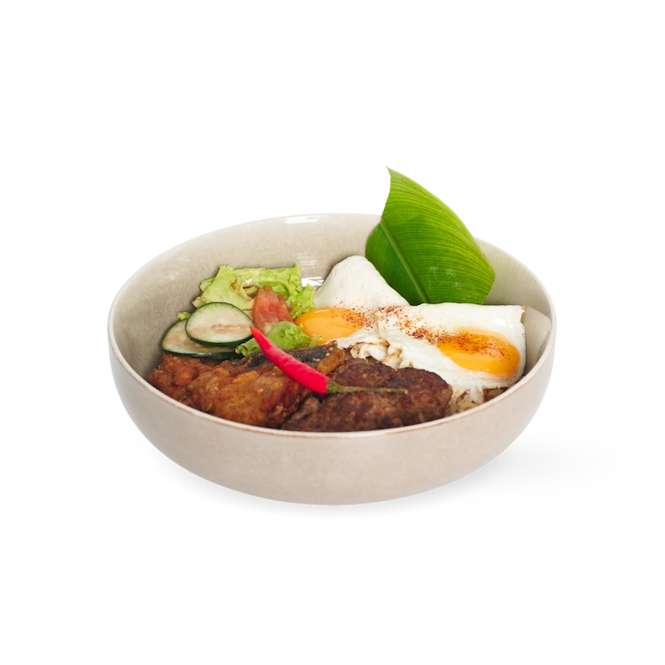 A hearty spread of adobo rice, sautéed vegetables, egg, Calumpit longganisa patties, and crispy ‘daing na bangus’.