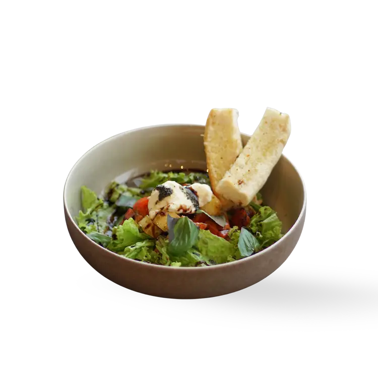 Lettuce, basil, and tomatoes, with our housemade stracciatella and finished with a drizzle of balsamic glaze.